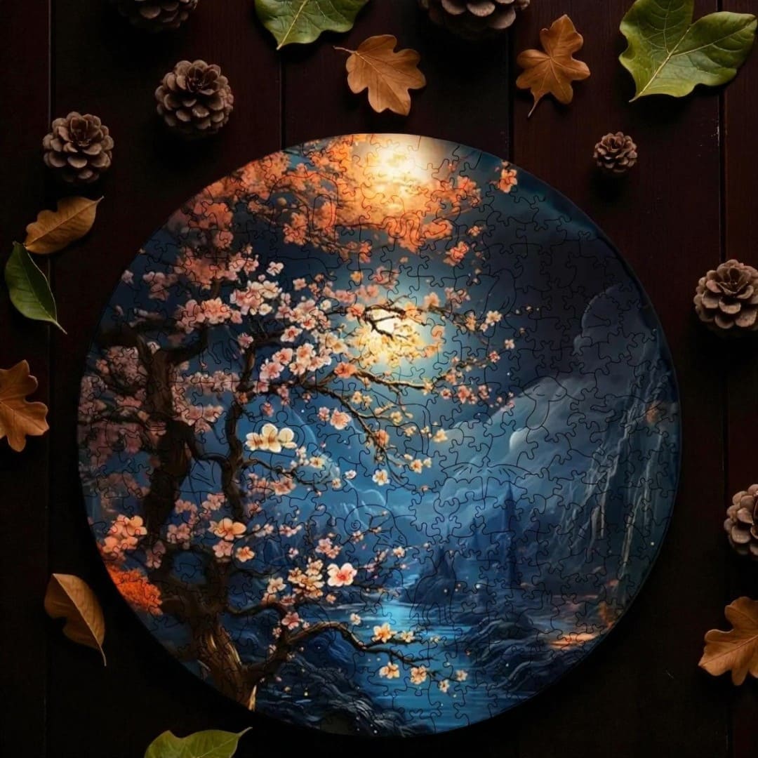 Chaque pièce de ce puzzle révèle un décor où la nature et la lumière s’unissent en parfaite harmonie. Les branches fleuries semblent danser sous le clair de lune, tandis que l’arrière-plan montagneux plonge le spectateur dans un univers onirique. L’ensemble dégage une sensation de calme et de beauté intemporelle.