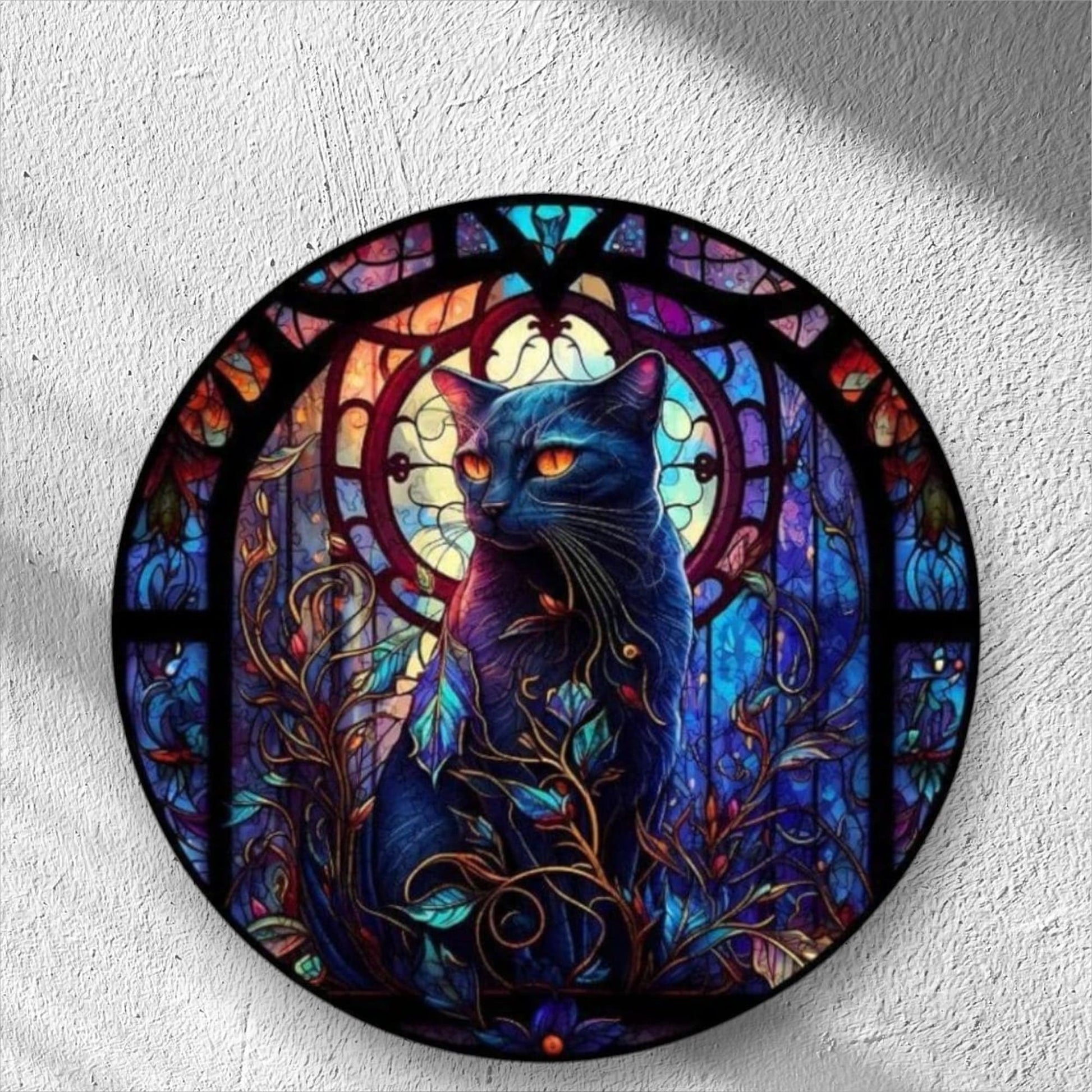 - Illustration unique : Un chat noir majestueux sublimé par un fond vitrail captivant,