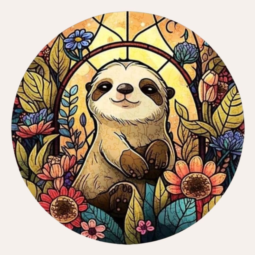 Ce puzzle circulaire allie des tons chaleureux et un design inspiré des vitraux, apportant une touche artistique et harmonieuse. Chaque détail, des feuilles aux fleurs, sublime l’univers calme et enchanteur du paresseux.